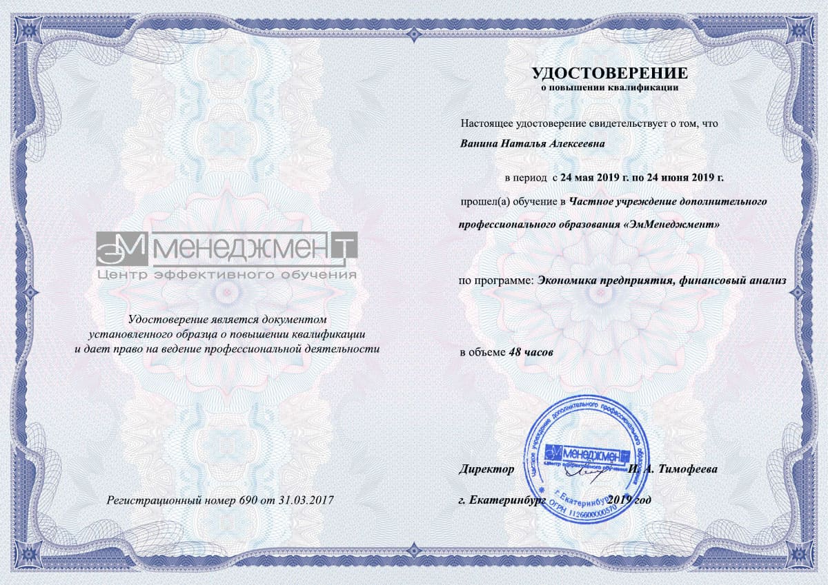 Повышение квалификации и расширение сфер деятельности – необходимое условие для успешного роста в нынешних реалиях. Центр обучения ЭмМенеджмент в Твери имеет лицензию министерства Образования и по окончанию курса выдается удостоверение государственного образца. Пройденный курс финансового анализа – хорошая инвестиция в себя и конкурентное преимущество при трудоустройстве на предприятие.